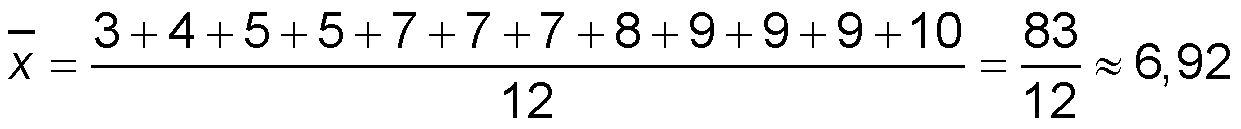 3, 4, 5, 5, 7, 7, 7, 8, 9, 9, 9, 10 donne une moyenne de